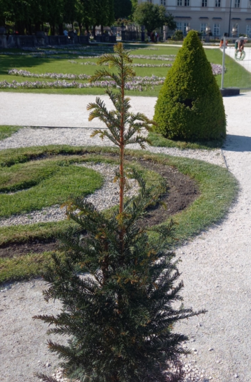 SALZBURG – Mirabell Garten – Der Buchsbaum gleicht einer Katastrophe! Perfekte Gärtner Arbeit! Die lila Blumen gehören weg blutrot kräftige Blumen gehören gesetzt.
