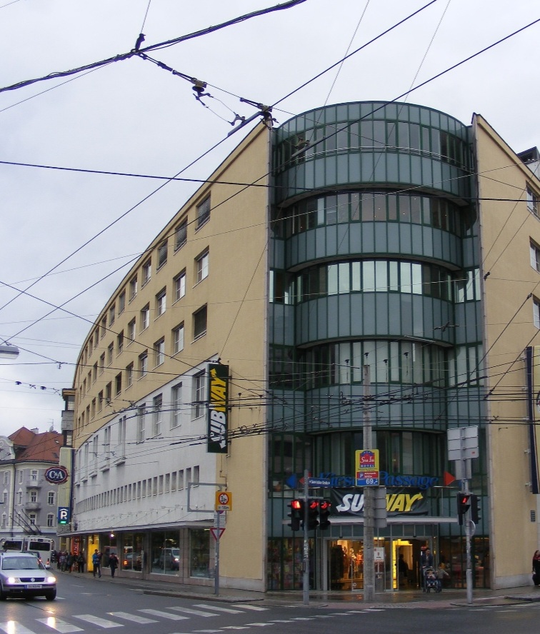 DAS KIESEL GEBÄUDE in SALZBURG STADT könnte als designer Shopping Center dienen. > STEIN AUßENFASSADE > GLAS KRONLEUCHTER BEIM EINGANG > PREISE BIS 5.000€